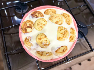 быстро, просто, безумно вкусно, и немножко калорийно:). Нежные, пышные сырнички в ароматной сметанно-сливочной подливкой. Они напоминают мое детство и детский садик. Это так вкусно, что невозможно оторваться.