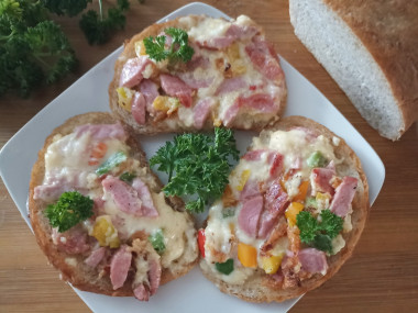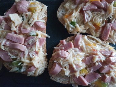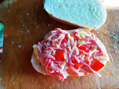 Просто, удобно и всем нравится. Когда нужно срочно приготовить что-нибудь на перекус, такие бутерброды выручат. Можно и такую мини-пиццу на хлебе соорудить. И начинка не разлетается, потому что бутерброды запекаются.