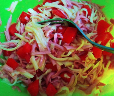 Нарежьте колбасу маленькими кубиками или соломкой, кому как больше нравится.