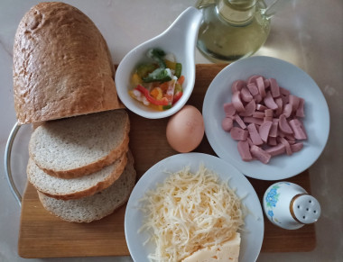 Как пожарить горячие бутерброды на сковороде с сыром и колбасой? Подготовьте ингредиенты по списку. По желанию набор используемых продуктов можно изменить. Сыр должен быть обязательно твердый, который плавится при нагреве, а сорт можно взять любой по вкусу. Колбасу также можно использовать любую по наличию и вкусу, вареную или полукопченую, подойдут даже молочные сосиски.