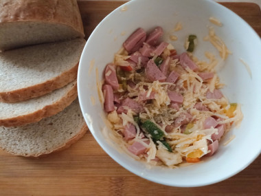 Добавьте в яичную смесь колбасу, твердый сыр, болгарский перец и зелень. Перемешайте ингредиенты. Заливка для бутербродов готова.