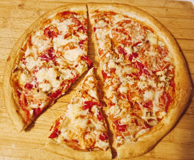 Тесто для пиццы без яиц понравилось простой приготовления и готовая пицца получилась вкусная, с хрустящей и в то же время не твердой кромкой.