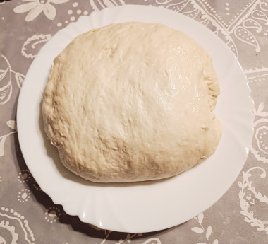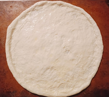 За ночь тесто очень хорошо подошло, в прохладной комнате. Было немного липкое, но смазав руки маслом и слегка припылив мукой прекрасно сформировалось в лепешку для пиццы.