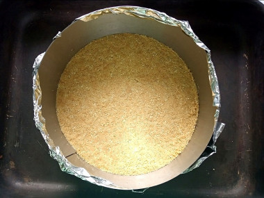 Подготовьте форму, в которой будете выпекать чизкейк. Я пеку в кондитерском кольце, диаметром 20 см, дно формирую из фольги, сложенной в несколько слоев. Форму я ничем не смазываю. Если вы печете в обычной форме, то смажьте дно и бока маслом, а дно тщательно оберните фольгой, потому что выпекать чизкейк мы будем в воде.