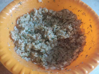 Когда все ингредиенты подготовлены - в миску выложите остывший рис, лук, размятые вилочкой консервы, мелко порезанный укроп, посолите, поперчите по вкусу и хорошо перемешайте.