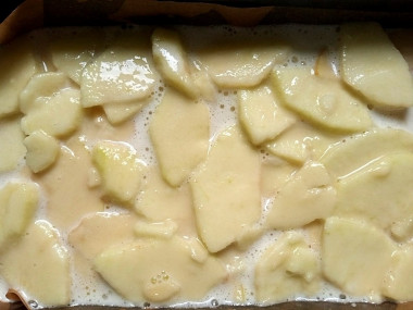Переложите яблоки в тесте в смазанную сливочным маслом форму для выпекания (Ø 18-20 см) и разровняйте. Поставить пирог в разогретую до 200°С духовку и выпекайте 30 минут.