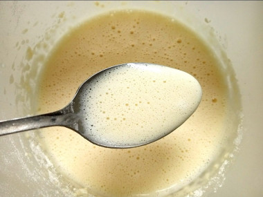 В тесто влейте молоко, коньяк и растительное масло. Еще раз взбейте. Должна получиться достаточно жидкая масса, похожая на блинное тесто. По необходимости добавьте ещё немного муки.
