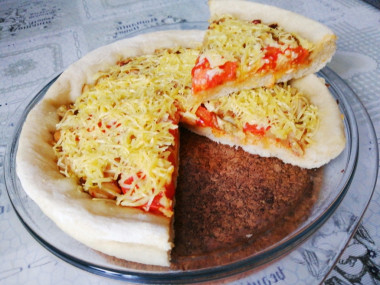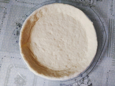 Форму для пиццы я взяла небольшую, где-то сантиметров 30 в диаметре. Половину теста отрезала и убрала в морозилку, чтобы приготовить в следующий раз. Оставшееся тесто раскатала и уложила в форму. Мне очень понравилась фотография пиццы на рецепте - с небольшими бортиками, загнутыми вверх. Я попробовала повторить эту форму, и всё получилось.