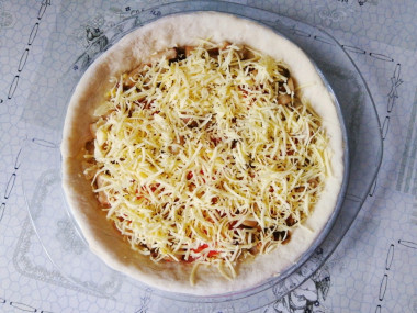 Смажьте тесто томатной пастой или соусом. Выложите на основу поочередно приготовленные для начинки ингредиенты. Отправьте пиццу в предварительно разогретую до 180 градусов духовку на 20-25 минут. Точное время зависит от особенностей вашей техники. Узнать об особенностях работы духовок можно, прочитав отдельную статью, ссылка в конце рецепта.