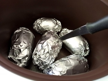 Приготовим ингредиенты. Такое блюдо без лишних хлопот и длительного стояния у плиты можно приготовить, имея под рукой мультиварку. Не все хозяйки догадываются, что в ней можно не только варить супы и выпекать пироги, но и запекать даже в фольге. Картофель, естественно, лучше использовать молодой, с тонкой кожицей и не очень крупный. Клубни картофеля тщательно моем, чтобы кожица во время запекания на клубнях не лопнула, вилкой делаем несколько проколов, можно ножом сделать надрез по кожице. Натираем клубни картофеля оливковым маслом и смесью соли, черного молотого перца, по желанию можно использовать готовую приправу для картофеля или любые специи по вкусу. Фольгу нарезаем на небольшие квадраты, чтобы хватило полностью обернуть каждый клубень и заворачиваем картошку. Картофель в фольге кладем в чашу мультиварки, но наполнять ее нужно не более чем на ¾ всего объема, иначе картофель плохо пропекется. Закрываем мультиварку крышкой, выбираем программу «выпечка» и ставим готовиться на час-полтора. Если такой программы в мультиварке нет, то нужно выбрать программу с аналогичными функциями или программу «мультиповар» и самостоятельно задать температурный режим. Во время приготовления блюда картофель можно проверить на готовность. Достаточно на картофель надавить, если он мягкий, значит, картофель пропекся. По желанию время запекания картофеля можно увеличить или уменьшить, выставим дополнительно нужное время или отключив программу.