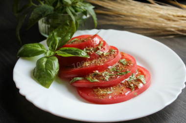 Итак, я беру свежие помидоры, любое количество. В этом случае мой любимый сорт томатов — это «Бычье сердце». Помидоры я, конечно, прежде всего мою, затем нарезаю вдоль сердцевины. То, что получилось, выкладываю на блюдо для закусок, посыпаю солью и сушеным базиликом. Для этой закуски сушеный базилик идеален. Все это оставляю на час, тем временем готовим заправку для помидоров. Для этого нужно смешать горчицу, красный бальзамический уксус, мед и оливковое масло до однородной консистенции и заправить закуску, по желанию украшаю зеленью кориандра. Можно подавать к водке и мясным блюдам. Эта закуска красиво смотрится на белой посуде. Приятного аппетита.