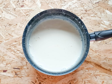 В эмалированную посуду налейте молоко. Поставьте емкость с молоком на плиту. На медленном огне, помешивая ложкой, доведите молоко до кипения и выключите огонь.