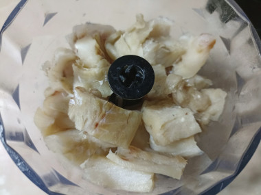 Минтай пропустите через мясорубку, через решётку с самыми маленькими отверстиями. Желательно сделать это два раза, чтобы убедиться в отсутствии косточек в фарше. При желании, для измельчения, можно воспользоваться блендером.