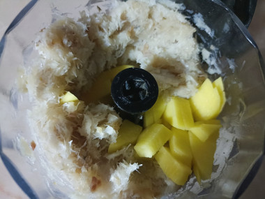 Картофель вымойте под проточной водой, тщательно потерев кожуру щёткой. Очистите картофель с помощью овощечистки или небольшого острого ножа. Порежьте клубень на кусочки и тоже пропустите через мясорубку.