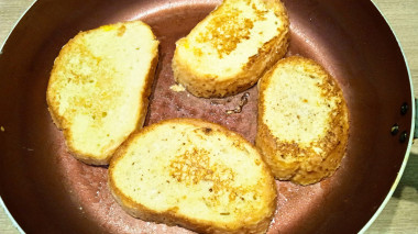 Выложите на разогретую с маслом сковороду ломтики хлеба в яичной смеси и жарьте до образования жёлто-золотистой корочки сначала с одной стороны, затем, аккуратно перевернув, с другой стороны. Нагрев должен быть средний, чтобы хлеб быстро не зажарился и от масла не пошёл неприятный запах.