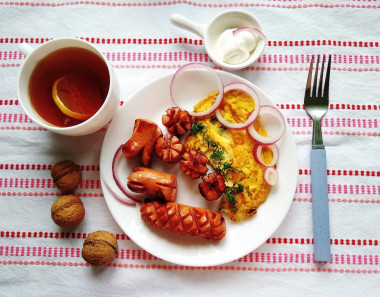Кроме того, оригинально пожарить сосиски можно и с яичницей, оформив их в виде цветка или сердечек, тогда из сосисок получаются бортики и яйцо остаётся внутри. Такая красивая подача подойдёт для романтического завтрака.