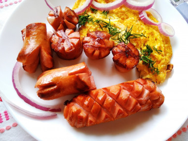 У подготовленных таким образом сосисок для жарки все надрезанные части раскрываются и получается очень интересное оформление готового блюда. Такие красивые и вкусные жаренные сосиски можно подать на завтрак, а можно порадовать детей ужином дополнив их макаронами или любым другим гарниром.