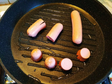 Сковороду разогрейте на среднем огне, налейте в неё растительное масло. Выложите подготовленные сосиски. Обжаривайте до румяной корочки со всех сторон. Как выбрать сковороду и масло для жарки читайте в статье в конце рецепта.