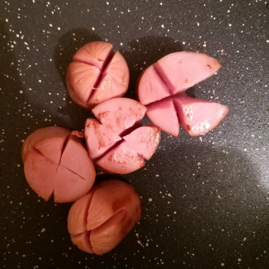 У меня после жарки не получаются маленькие цветочки на тарелке. Девушка в рецепте не пишет, как " ...стандартную сосиску разрезать на 4 - 5 частей толщиной 1-5 - 2 см". Я только по фото догадалась. Еще я не очень понимаю, как она сделала "...надрезы, разделяя сосиску на шесть сегментов". У меня получилось 4.