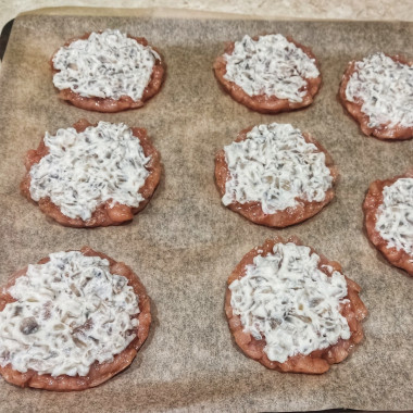 На противень выкладываем листы фольги, смазываем их растительным маслом. Из подготовленного фарша формируем медальоны круглой формы и выкладываем их на противень.