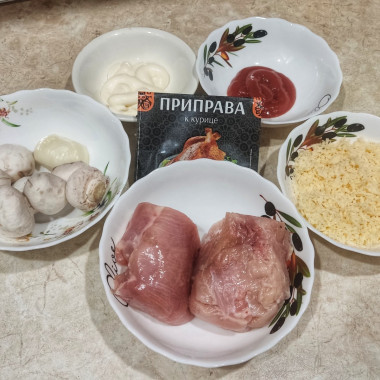 На сегодняшний день многие хозяюшки используют куриное мясо на своей кухне на постоянной основе. Чтобы куриное мясо не получалось суховатым, как это часто бывает, приходится экспериментировать. Сегодня мной был проведен еще один эксперимент, и он удался. В данном рецепте для придания медальонам сочности были использованы кетчуп и майонез. На самом деле их можно заменить, например, вместо майонеза можно использовать сметану или натуральный йогурт, кетчуп также можно заменить. Также они не получатся сухими, так как медальоны дополняет начинка из грибов, лука и конечно же сыр. Для тех, кто любит зелень, в куриный фарш можно добавить немного рубленного укропа.