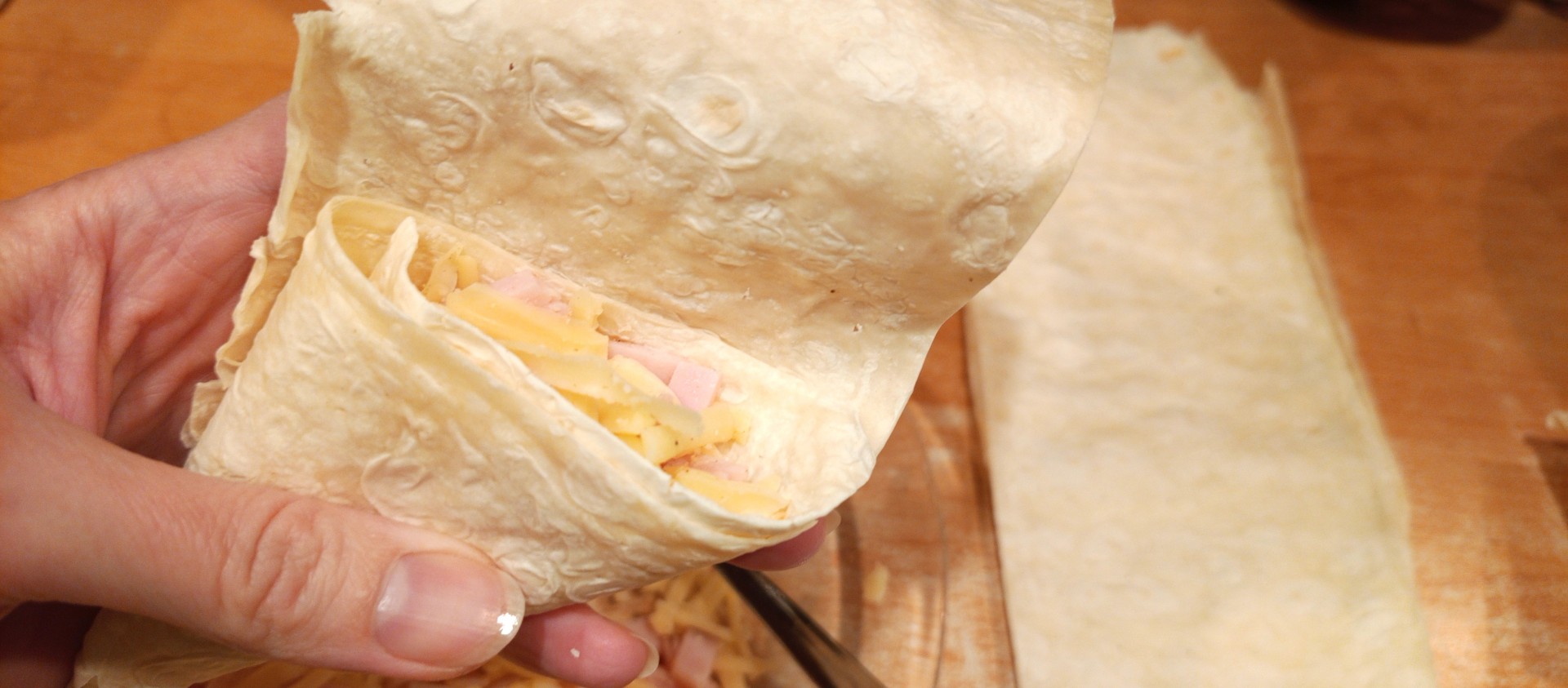 На край лаваша выложите начинку из сыра и ветчины.