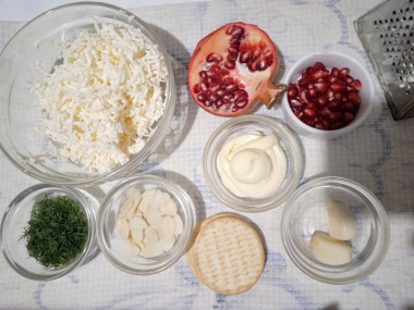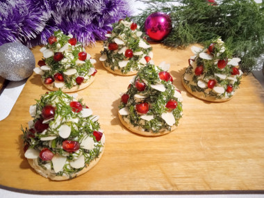 Сделала в преддверие праздника новогодние канапе ёлочки сырные. Решила потренироваться и сократила количество продуктов в два раза. Использовала для приготовления плавленый сыр. Крекеры у меня в диаметре 5 см. Получилось 5 ёлочек. Приготовить салат из сыра, чеснока и майонеза совсем не составило труда. Самый длительный процесс - украшение. Сначала отобрала красивые и не поломанные миндальные хлопья. Потом почистила гранат и выбрала зёрнышки. Затем мелко порубила свежую зелень укропа. Уложила на каждый крекер по 2 чайные ложки с горкой сырной массы и сформировала конус. Прилепила, а не посыпала, сверху измельчённый укроп. Зелень осыпается, поэтому нужно слегка прижимать укроп к салату. Вставила миндальные лепестки и зерна граната в хаотичном порядке. Вроде совсем не сложно, но затратно по времени, особенно если делать большое количество закуски. Поэтому нужно к празднику готовиться накануне. Вид конечно у новогодней закуски шикарный. Очень реалистичные ёлочки получились. Они восхитительно пахнут свежим укропом и чесноком. Такая закуска очень радует глаз и обязательно украсит праздничный стол. И несомненно это вкусно и остренько) буду к новому году готовить десять ёлочек и всем рекомендую. Это превосходный рецепт из доступных продуктов. Огромное спасибо автору за отличную идею и праздничное настроение😊