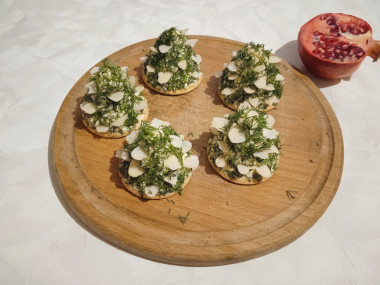На каждый круглый крекер горкой выложите получившуюся закуску и придайте ей конусную форму.