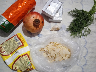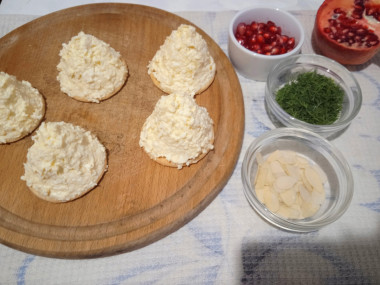 Возьмите первую закуску на крекере, посыпьте ее измельченной петрушкой, распределите на ней в произвольном порядке миндальные лепестки и зерна граната. То же самое сделайте с остальными закусками. Готовые елочки поставьте на блюдо и подавайте к праздничному столу.