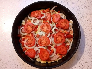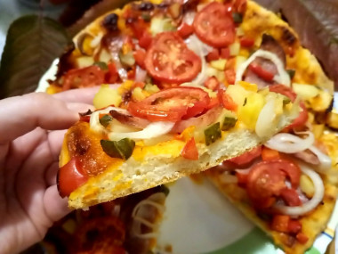 Вечером прямо нестерпимо захотелось пиццу, а сыра дома не было) Хорошо, что на сайте нашелся подходящий рецепт. Быстро и без проблем приготовила пиццу без сыра с колбасой в духовке. Состав продуктов для теста мне показался необычным, почти как заливное. Для того, чтобы собрать тесто в ком мне понадобилось 1,5 стакана муки (стакан 250 мл.) Настаивать его времени не было, поэтому сразу распределила тесто руками в смазанной маслом форме. Сверху выложила картошку и солёные огурцы, нарезанные кубиком. Колбаса у меня была ветчинная, нарезала её полукружьями. Перец нарезала кубиками, лук кольцами. От себя добавила пару помидорок кружочками. Часто говоря опасалась, что вся эта начинка упадет с теста) Запекала 20 минут при 180° верх-низ. Потом решила немного поджарить верх и поставила под гриль на 10 минут. Пицца получилась просто огонь! Даже не ожидала такого результата. Начинка никуда не упала, все на месте. Тесто отличное, мягкое, низ хрустящий. Это очень вкусно, даже сыра не надо. Рекомендую!