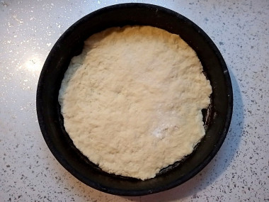 Раскатайте тесто на подсыпанной мукой рабочей поверхности в тонкий пласт по размеру формы для выпечки. Дно формы смажьте сливочным маслом и выложите на нее тесто. О том, как выбрать форму для запекания, читайте в отдельной статье по ссылке в конце рецепта.