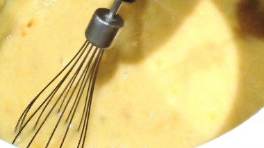 В другую миску положите остывшее пюре. Добавьте к нему вторую половинку белка (не взбитого). Начните взбивать смесь на высокой скорости миксера. Она посветлеет и увеличится в размере.