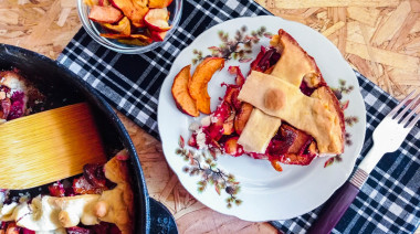 Пирог должен слегка подрумяниться сверху. Выньте готовый пирог из духовки, немного остудите и подавайте к столу. Точное время зависит от вашей духовки. Узнать об особенностях работы духовок можно, прочитав отдельную статью, ссылка в конце рецепта. Приятного аппетита!