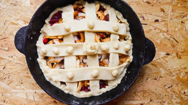 Из оставшегося теста сделайте решетку для оформления пирога, по желанию пирог можно украсить по-другому. Чтобы пирог получился красивым и румяным, смажьте его взбитым желтком. Отправьте заготовку пирога в духовку, разогретую до 180 градусов, примерно на 30 минут.