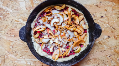 Для начинки вместо свежих яблок использовала сушеные яблочные дольки. И клюкву, и яблоки взяла на глаз. Сахара добавила 2 столовые ложки. Выпекала пирог в чугунной форме (диаметром 26см) около 40 минут при 180 градусах.