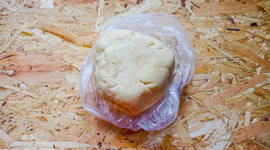 Замесите эластичное и гладкое тесто, долго месить руками песочное тесто не нужно, иначе оно будет тугим, а изделия из него твердыми. Оберните тесто в пищевую пленку и уберите на полчаса в холодильник. Включите духовку на 180 градусов.
