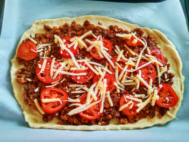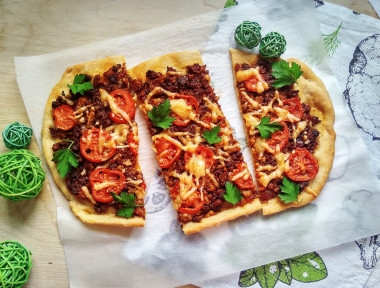 Пиццу с фаршем я еще не готовила, очень интересно было попробовать. Фарш у меня был смешанный из свинины и говядины. Все пропорции я уменьшила пополам, чтобы получилась одна небольшая пицца. Лук с фаршем обжарился довольно быстро, затем посолила, поперчила и добавила томатную пасту. Мне показалось, что немного суховато, добавила немного воды. После этого начинка стала очень сочной, обжаренный фарш вкусный и ароматный. Тесто замесилось хорошо, подходило полчаса. Раскатывала тесто без добавления муки, лепешка легко раскаталась. Я придала ей овальную форму, просто так захотелось. Помидорок у меня ушло две штуки средних. Запекала пиццу 15 минут, к этому времени она была уже готова. Лепешку раскатывала тонко и тесто сильно не поднялось. Корочка хрустящая получилась. Начинка осталась сочной, что меня очень порадовало) С помидорами фарш отлично сочетается, получается приятное послевкусие. Мне пицца понравилась, детям тоже. Спасибо за рецепт!