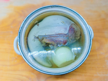 Доведите воду еще раз до кипения и закиньте в бульон очищенную целую луковицу. Можете также положить целую морковь и корень сельдерея.