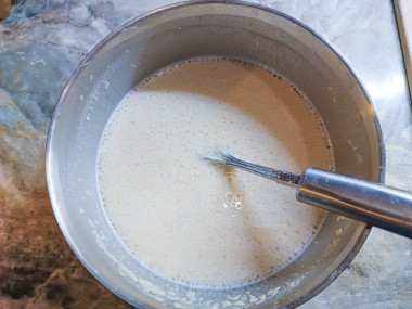 Добавьте к молоку щепотку соли и немного сахара, все перемешайте. Если вы любите сладкие блины, то можно добавить сахара немного больше.