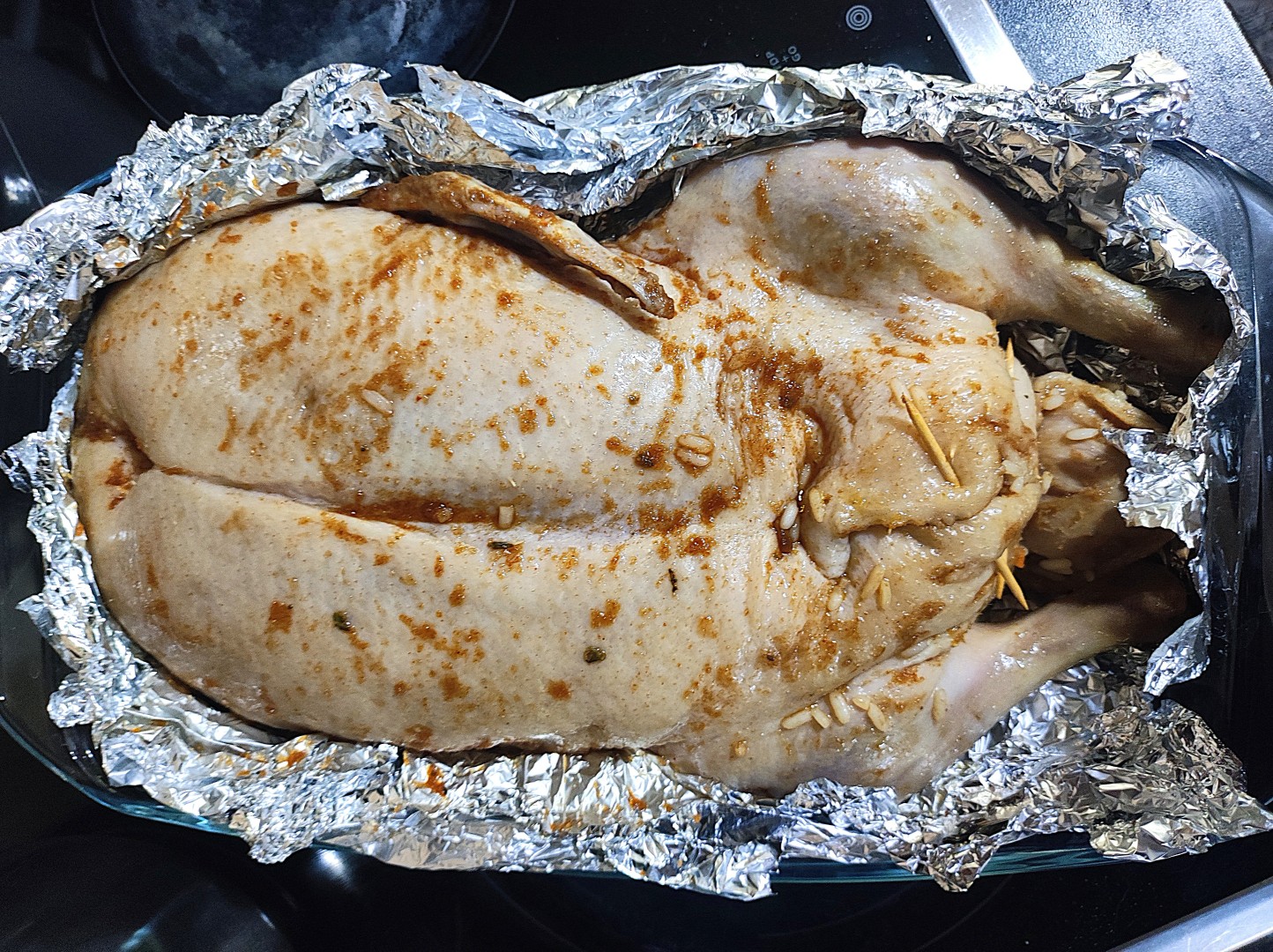 Заверните начинённую утку в фольгу, отправьте в форму для запекания и поставьте в духовку примерно на 1 час при 180-190 градусах, режим "верх-низ". По истечении указанного времени достаньте форму из духовки, фольгу сверху разрежьте и отправьте утку снова запекаться на 1-1,5 часа. точное время зависит от особенностей вашей духовки. За 15-20 минут до готовности измените режим духовки на конвекцию, для образования румяной корочки.
