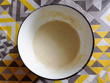 Влейте ледяную воду, добавьте желток. Перемешайте кляр венчиком до однородности. Тесто должно получиться густое. Оставьте кляр на 2-3 минуты, чтобы он еще немного загустел, когда из муки выделится клейковина. Кляр должен получиться достаточно вязкий, чтобы не стекать с креветок, как вода. Если кляр слишком жидкий - добавьте еще немного муки.