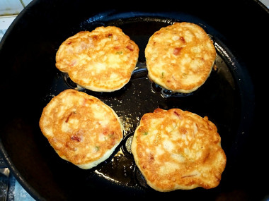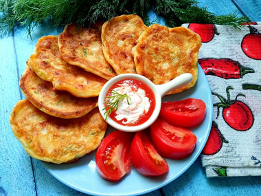 Затем переверните лопаткой и продолжите жарить оладушки со второй стороны в течение пары минут. Затем сковороду накройте крышкой и подержите оладушки на сковороде еще несколько минут, чтобы они хорошо пропеклись внутри. Снимите оладьи со сковороды на бумажное полотенце, чтобы лишнее масло впиталось в бумагу. Затем оладушки переложите на блюдо для подачи. Подавайте пиццу к столу со сметаной, майонезом или иным соусом по вкусу. Приятного аппетита!