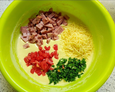 В миску с яичной смесью выложите все приготовленные ингредиенты.