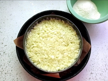 Пирог выпекала в форме диаметром 22 см. Она разъемная, между дном и бортиками зажала лист пергамента и установила в старую цельную форму. Пекла 1 час 20 минут, верх прикрыла фольгой.