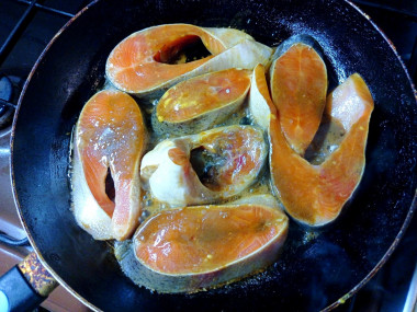Разогрейте сковороду и выложите на нее стейки форель. Обжаривайте на среднем огне, под крышкой 3 минуты. Когда я выложила рыбу на сковороду, то полила ее 2-3 ст. л. соуса в котором она мариновалась.