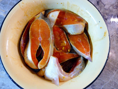 Стейки форели выложите в просторную миску и залейте маринадом. Оставьте так мариноваться нашу рыбку на 20 минут.
