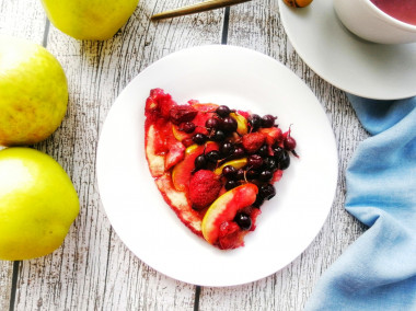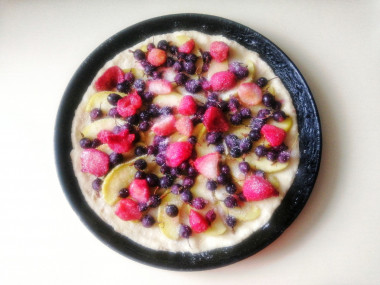 В качестве наполнения для пиццы я использовала яблоки, клубнику, черную смородину, облепиху, малину. Можете взять иные ягоды и фрукты, какие у вас есть в наличии. Ягоды можно использовать не только свежие, но и замороженные. Размораживать ягоды перед приготовлением не обязательно.