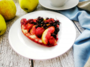 Немного усовершенствовала рецепт и потомила нарезанное на дольки яблоко в растопленном сливочном масле с сахаром в сковороде. Яблочко стало мягким, ароматным и приятным на вкус. Выложила дольки на приготовленное тесто (оно готовится очень просто и быстро), добавила также замороженные ягоды. Присыпала начинку сахаром.