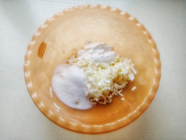 Добавьте сметану и сахар, щепотку ванилина. Перемешайте ингредиенты до получения однородной массы.