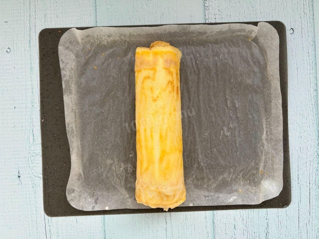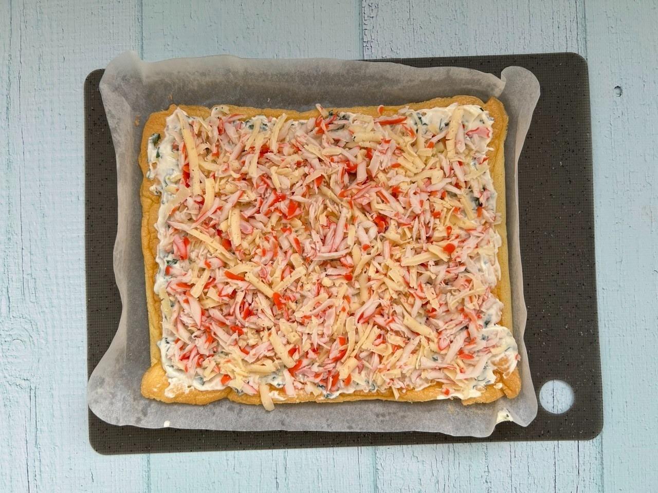 Остывший яичный омлет смажьте майонезом, в котором уже содержатся зелень и чеснок. После этого равномерно выложите начинку из крабовых палочек и сыра на всю поверхность омлета.Шаг 7. Как правильно свернуть рулет?